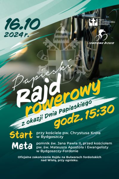 Rowerowa Brzoza ZAPRASZAMY 16.10 (środa) na Papieski Rajd Rowerowy - start o godz. 15.30 przy kościele pw. Chrystusa Króla w Bydgoszczy, a meta pod pomnikiem św. Jana Pawła II w parafii pw. św. Mateusza Apostola i Ewangelisty w Bydgoszczy - Fordonie