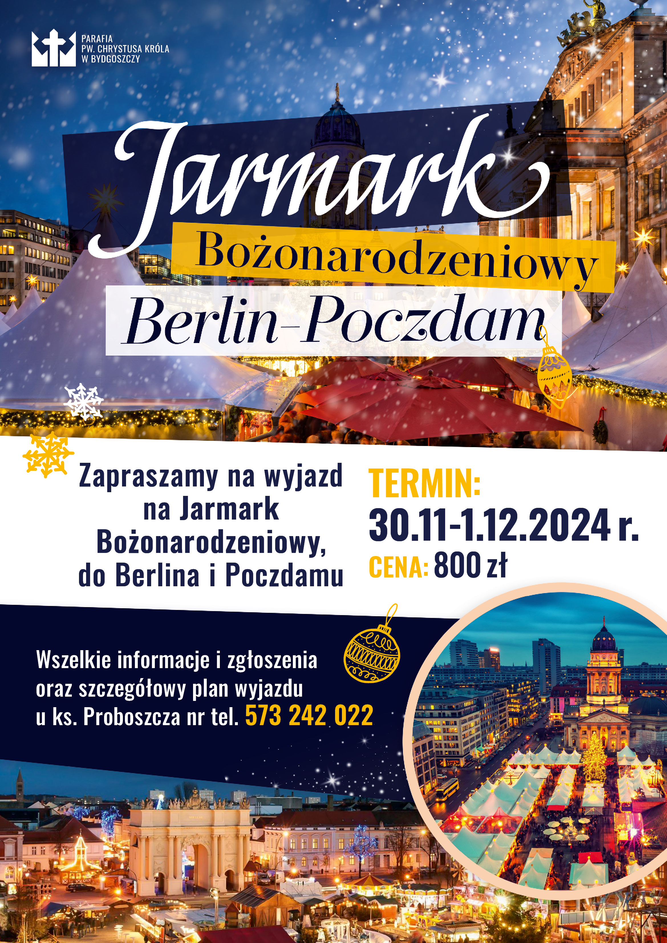 W sobotę, 30.11, we wczesnych godzinach porannych zbiórka uczestników, a następnie przejazd w kierunku Berlina. Po dojeździe zwiedzanie miasta z przewodnikiem, m.in.: Mur Berliński, Topografia Terroru, Potsdamer Platz, Reichstag, Brama Brandenburska, Pomnik Pomordowanych Żydów Europy. Przejście na Alexanderplatz - czas na największym Jarmarku Bożonarodzeniowym w Berlinie. Przejazd do hotelu na obiadokolację i nocleg.