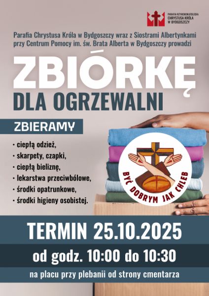 Nasza Parafia i Grupa Modlitewna św. Ojca Pio ogłasza zbiórkę darów dla osób potrzebujących, korzystających z pomocy ogrzewalni przy Centrum Pomocy im. św. Brata Alberta (ul. Koronowska 14, Bydgoszcz). Głównie zbieramy: ciepłą odzież, skarpety, czapki, ciepłą bieliznę, lekarstwa przeciwbólowe, środki opatrunkowe, środki higieny osobistej. Rzeczy te można przynieść w najbliższą sobotę, 25.10, od godz. 10.00 do 10.30. Miejsce zbiórki to plac przy Domu Parafialnym, od strony cmentarza. W imieniu Sióstr Albertynek, za wszystko już dziś BARDZO DZIĘKUJEMY.