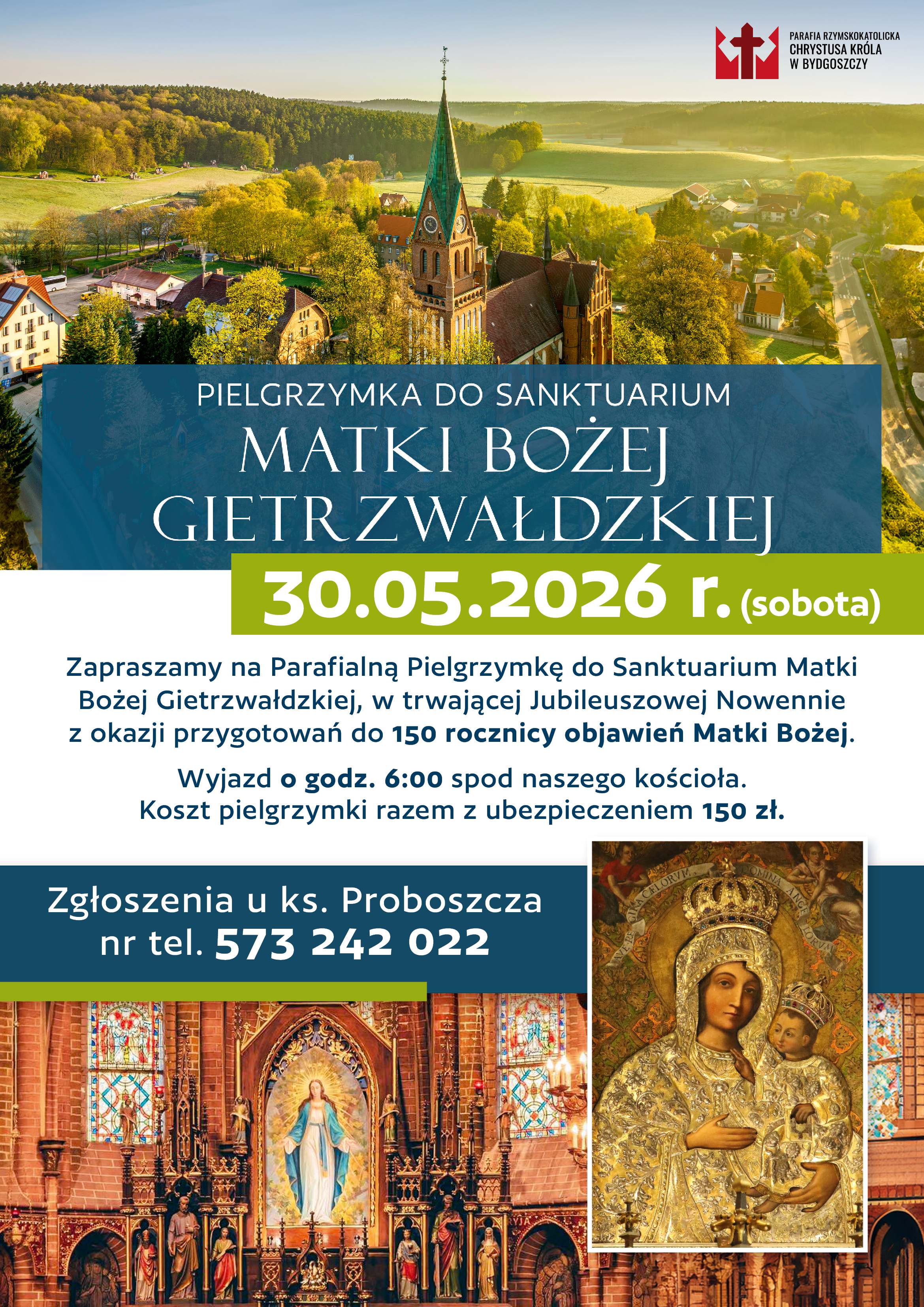 Zapraszamy na Parafialną Pielgrzymkę do Sanktuarium Matki Bożej w Gietrzwałdzie. Wyjazd w sobotę, 30.05 br., o godz. 6.00, a powrót w godzinach wieczornych. Koszt (razem z ubezpieczeniem) 150 zł. Zapisy w zakrystii, biurze parafialnym oraz bezpośrednio u ks. Proboszcza (+48 573 242 022)