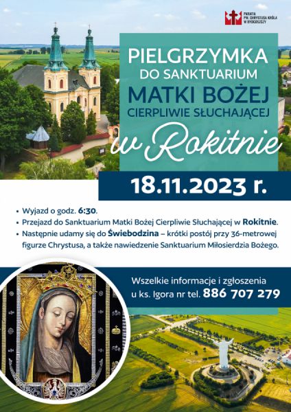 Zapraszamy na Parafialną Autokarową Pielgrzymkę do Sanktuarium Matki Bożej Cierpliwie Słuchającej w Rokitnie - 18.11 w sobotę. Zbiórka uczestników o godz. 6:15. Wyjazd o godz. 6:30. Znajdujący się tam obraz Matki Bożej słynący łaskami, był symbolem polskości w czasie zaborów. 18 czerwca 1989 r. prymas Polski kard. Józef Glemp dokonał uroczystej koronacji wizerunku Matki Bożej Rokitniańskiej koroną, która wcześniej była poświęcona przez Jana Pawła II. O godz. 11.00 msza św. w Sanktuarium. Następnie udamy się do Świebodzina – krótki postój przy 36-metrowej figurze Chrystusa, a także nawiedzenie Sanktuarium Miłosierdzia Bożego. Zbiórka uczestników o godz. 6:15. Wyjazd o godz. 6:30. Przyjazd do Bydgoszczy w godzinach wieczornych. Koszt pielgrzymki to 160,- zł, a zapisy u ks. Igora.