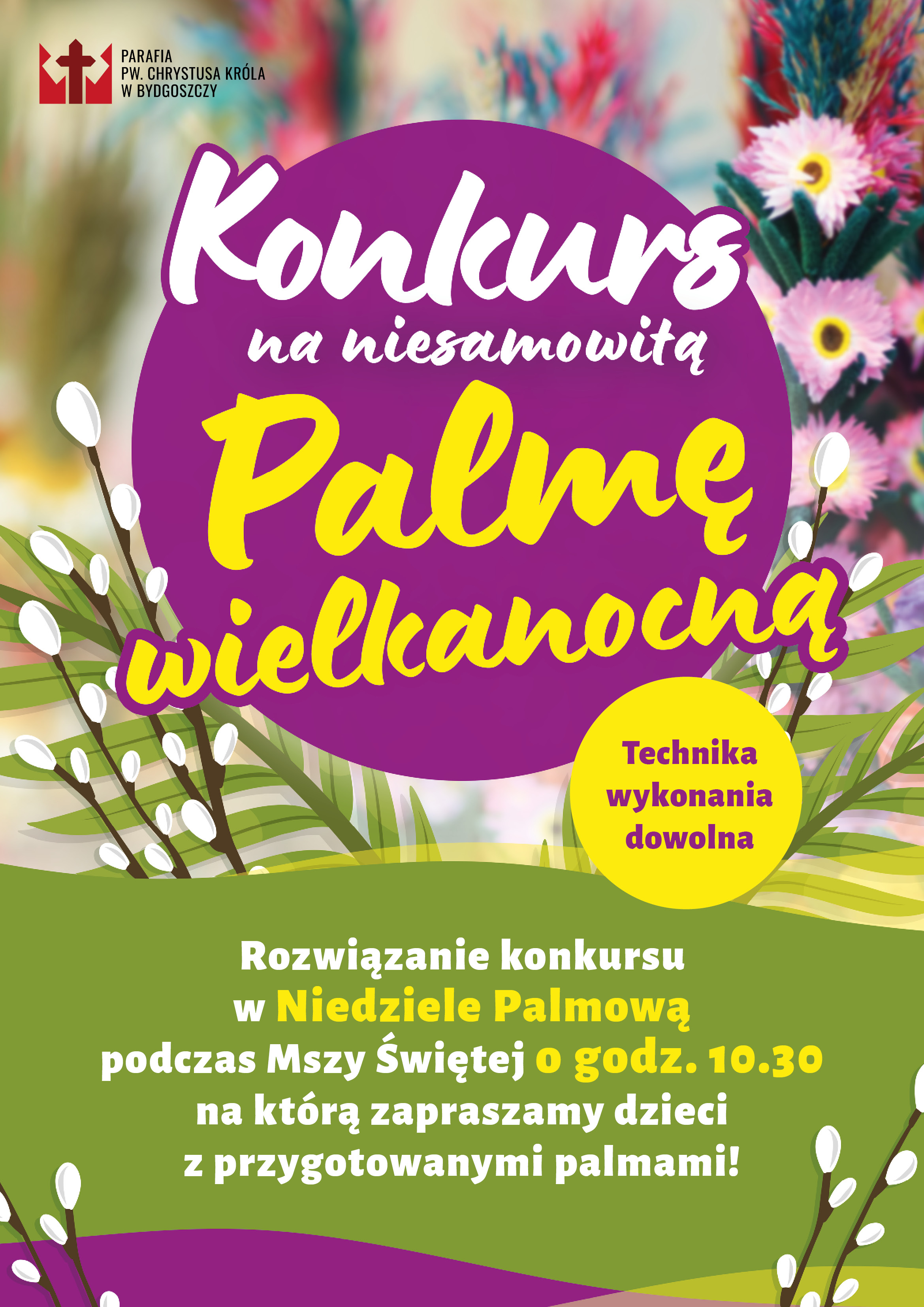 Konkurs na Niesamowitą Palmę Wielkanocną- zapraszamy do udziału wszystkie dzieci, ale i nie tylko. Technika wykonania dowolna. Rozwiązanie konkursu w Niedziele Palmową, podczas Mszy św. o godz. 10.30.